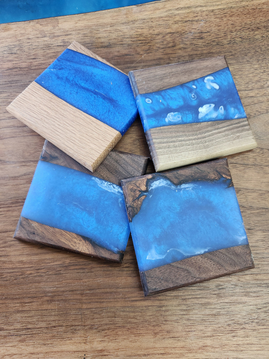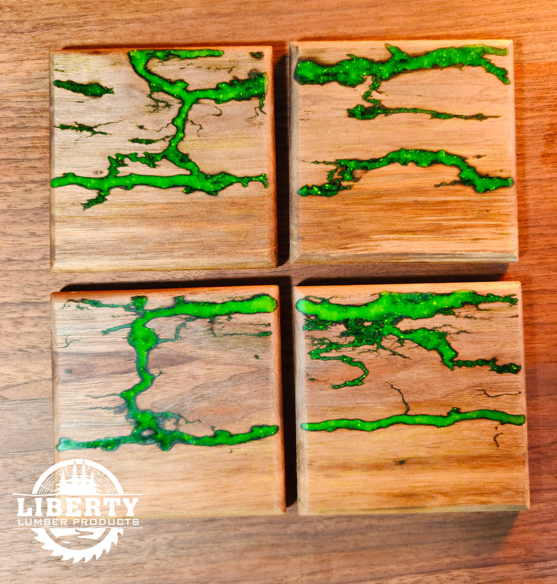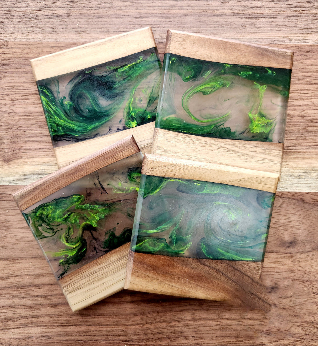 4" x 4" glow in the dark epoxy and wood coaster set.