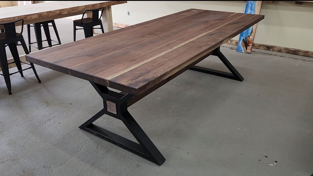 This stunning, handcrafted table is built from premium grade solid black walnut and features a crystal clear polyurethane finish for lasting protection. The custom welded steel base adds a bold, modern touch. Built to last and made to impress.