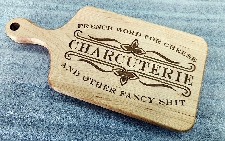 12.75" x 6" maple charcuterie board with laser engraved design.