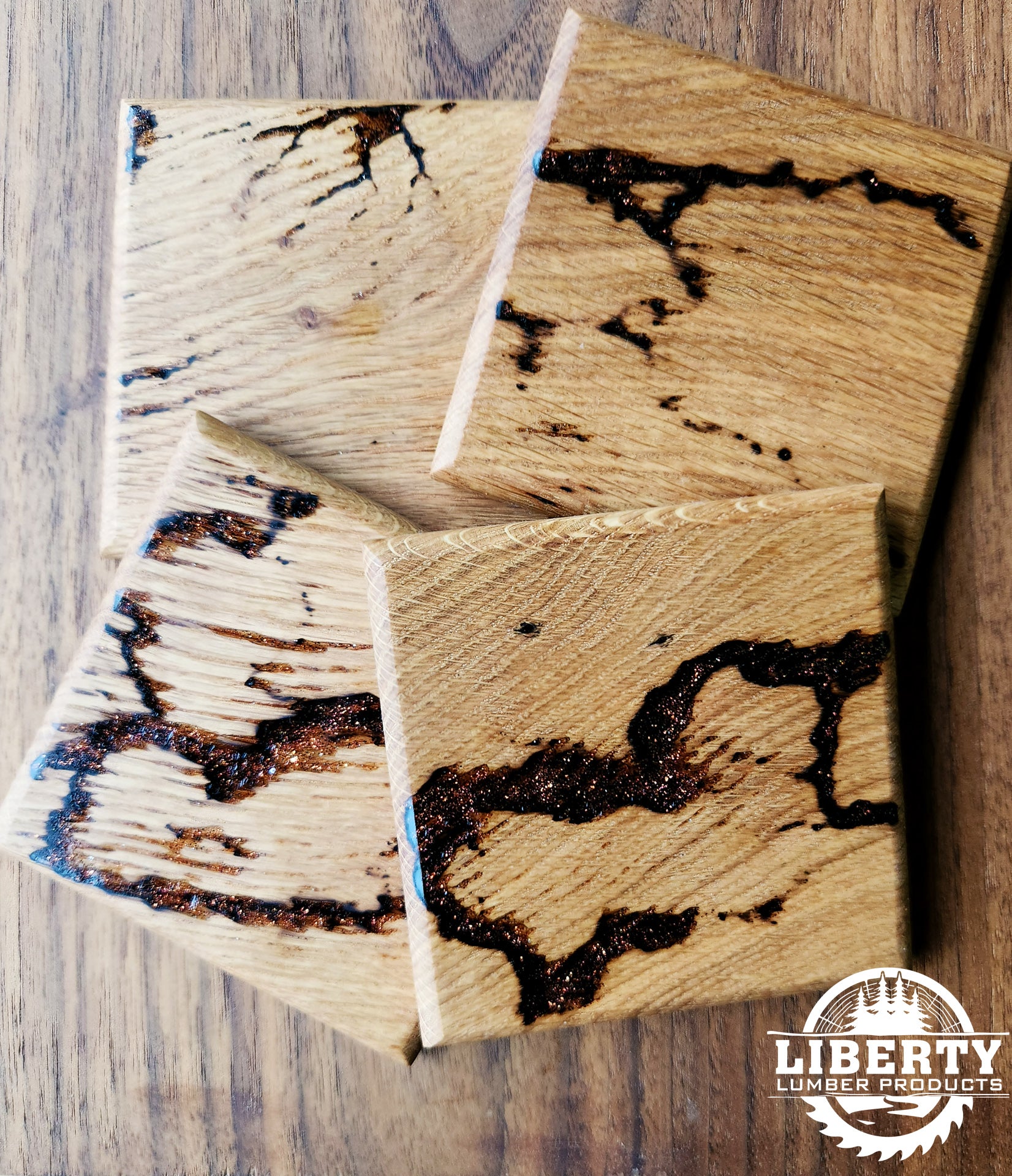 4" X 4" wooden coaster set with a fractal burn in them that is filled with epoxy.