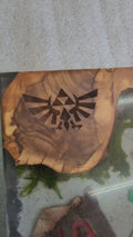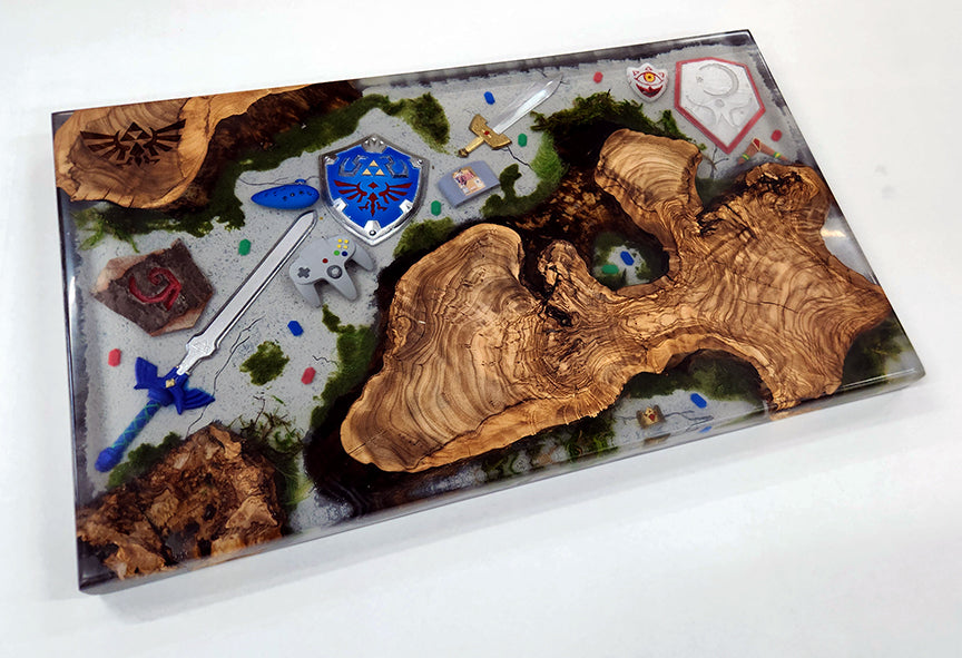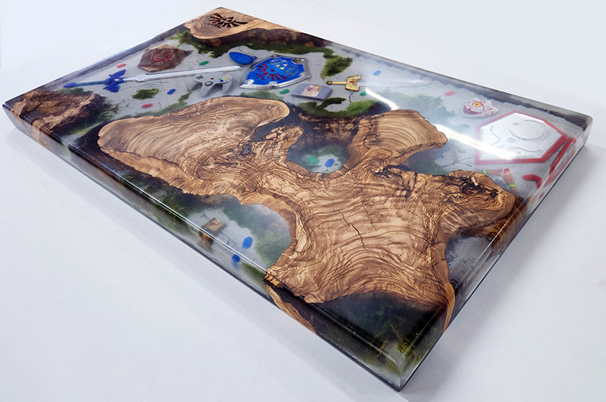 The rich, unique patterns of the olive wood are complemented by a vibrant, high-quality Wisebond Epoxy resin, which encapsulates meticulously hand-painted 3D objects from the game. From the glowing Triforce to miniature shields and swords, each detail tells a story, creating a conversation piece that brings the world of Hyrule to life.