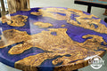 Crafted from a 300-year-old olive wood root burl sourced from the verdant groves of California, the table showcases the intricate and mesmerizing grain patterns that only centuries of growth can produce. The natural beauty of the wood is expertly complemented by mesmerizing purple epoxy, which fills the burl's crevices and enhances its organic shapes, adding depth and a touch of modern elegance.