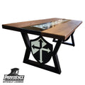 Adding to its distinctiveness, the custom steel legs are a true showstopper — forged in a bold, geometric design featuring the iconic Cross and Shield logo, giving the table both strength and a powerful nod to Providence tradition.