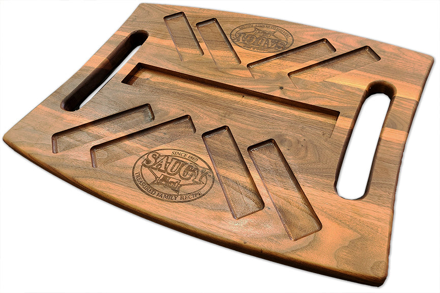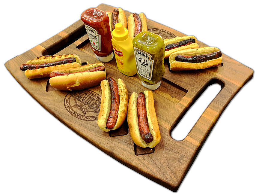 Introducing the officially licensed Saugy Hot Dogs Carrying Tray – the perfect addition to any hot dog enthusiast’s collection! Crafted from high-quality black walnut, this elegant tray measures 24" x 18" and features 8 dedicated slots, each designed to securely hold a hot dog, so you can serve up to 8 delicious dogs with ease. The center slot is perfect for holding your favorite condiments, keeping everything organized and within reach. Branded with the iconic Saugy Hot Dogs logo, this tray is not only functional but also a stylish nod to the beloved brand. Whether you're hosting a backyard BBQ or serving up hot dogs at a family gathering, this tray ensures your serving experience is as seamless as it is stylish. Officially licensed and built to last, it's a must-have for any true Saugy fan!
