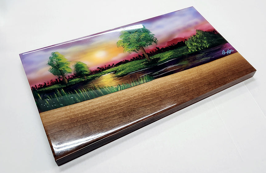 Elevate your space with this unique, handcrafted epoxy resin art board. Featuring an original landscape painting of a tranquil sunset scene, this piece seamlessly blends the beauty of art with the functionality of a serving board or decorative accent. Each board is meticulously crafted, ensuring a one-of-a-kind piece that adds a touch of elegance and warmth to any home. Perfect for entertaining or as a thoughtful gift for art lovers.