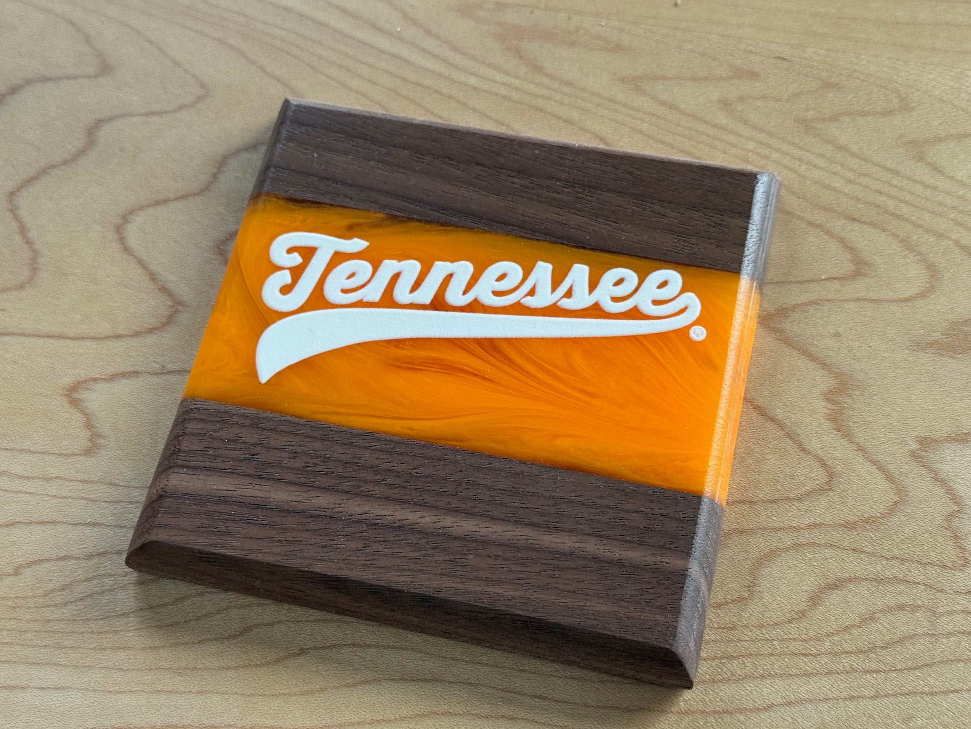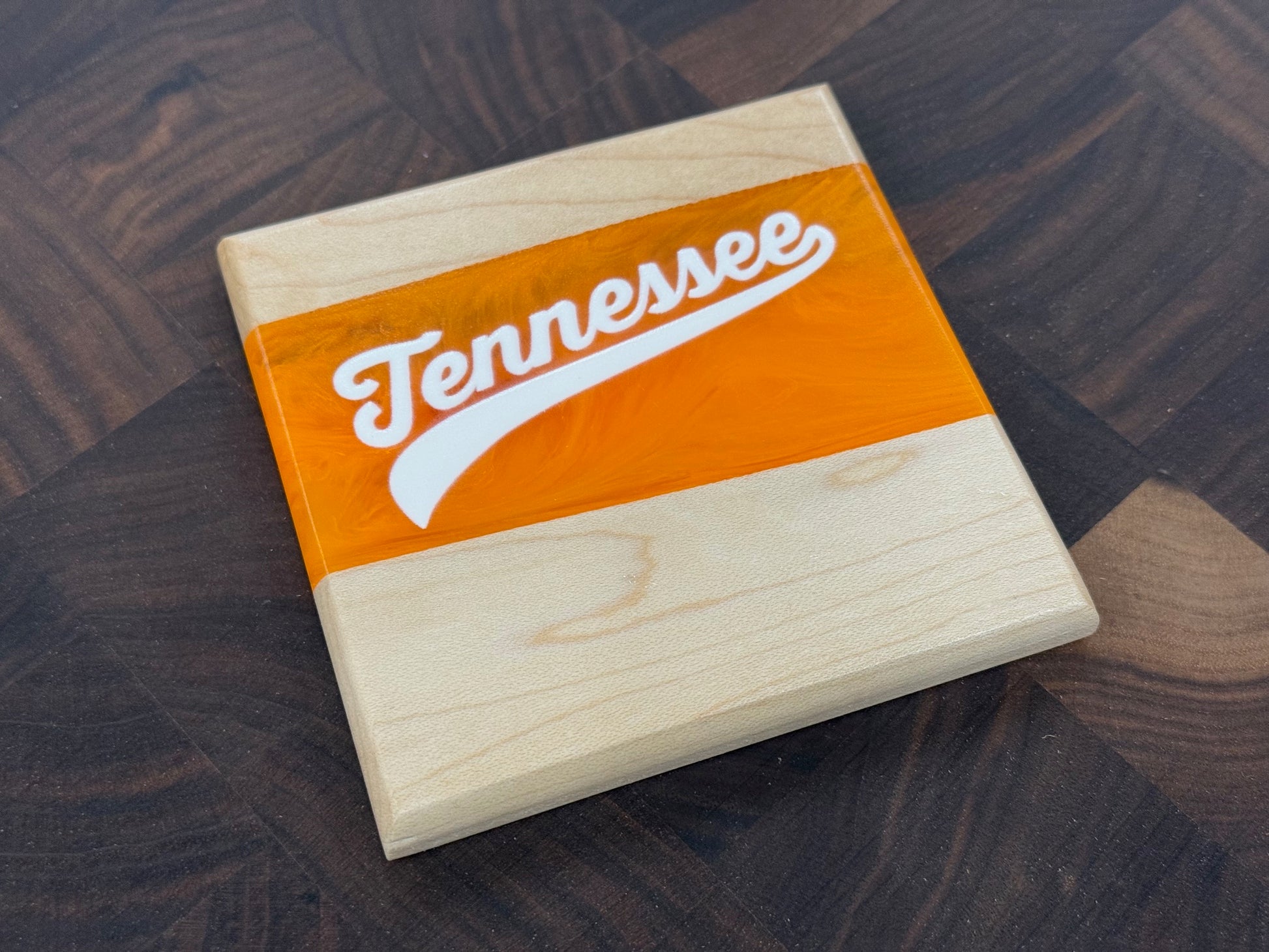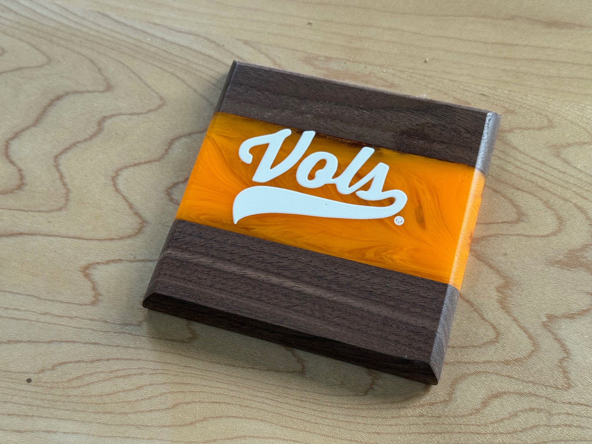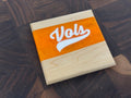 Show off your Volunteer pride with these handcrafted Maple and Walnut coasters. Each piece features a bold river of Vols orange or White epoxy flowing through the center. Across the river runs UV printed logos, giving these coasters a clean and striking design that fans will recognize instantly.