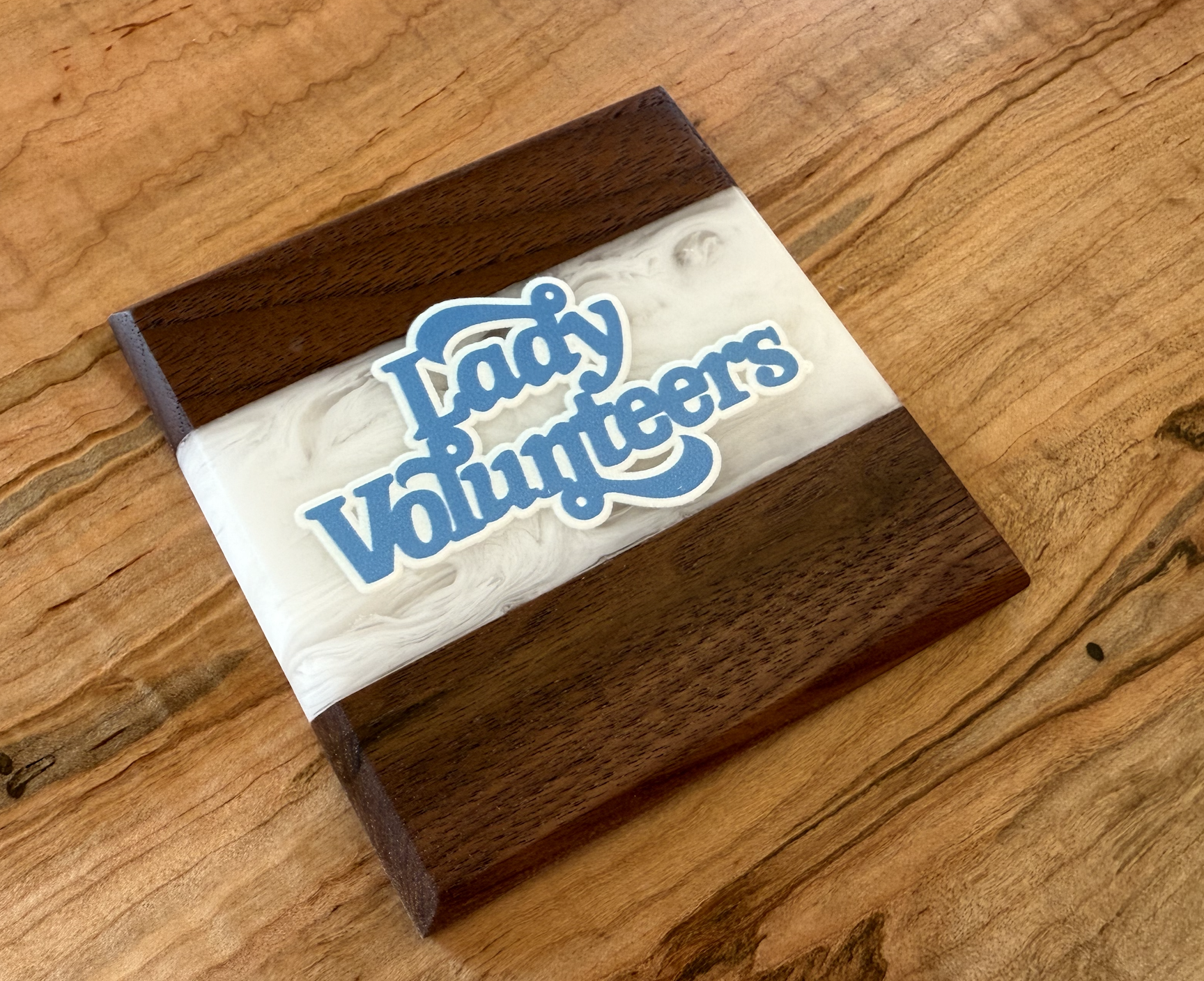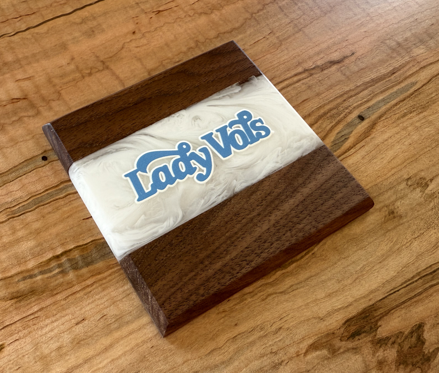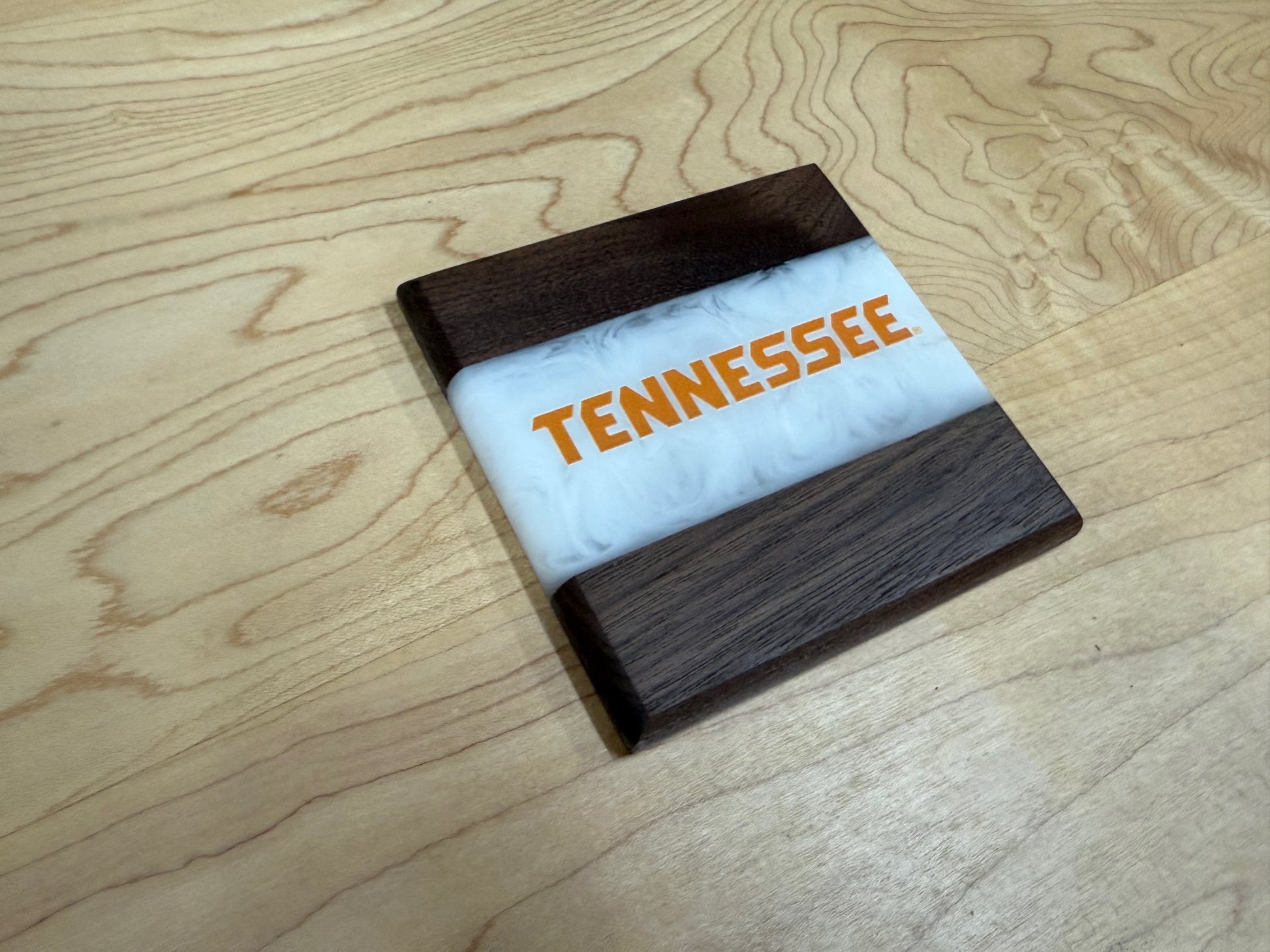 Show off your Volunteer pride with these handcrafted Maple and Walnut coasters. Each piece features a bold river of Vols orange or White epoxy flowing through the center. Across the river runs UV printed logos, giving these coasters a clean and striking design that fans will recognize instantly.